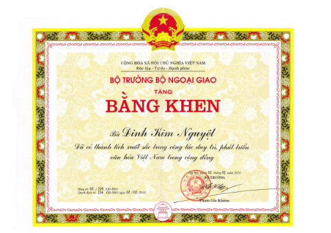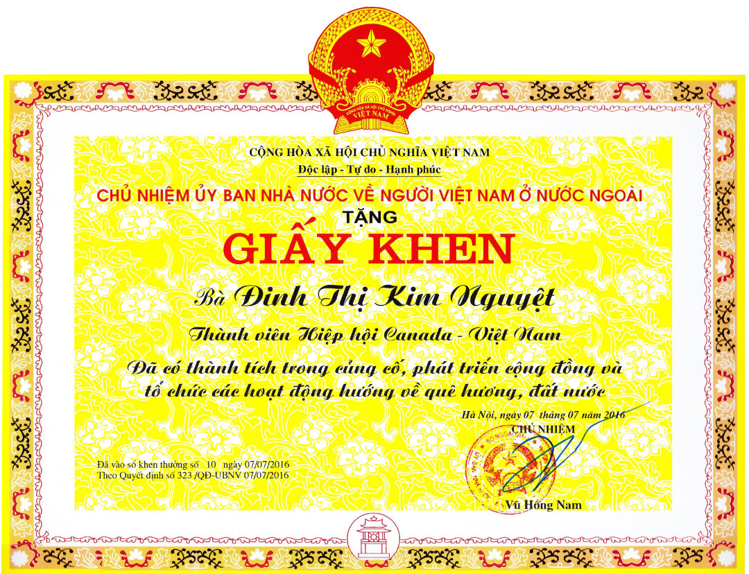 This is an inventory of awards that Vietnam has given to Dinh Kim Nguyet for her work in Canada. The awards recognize the work she is doing to promote Vietnamese identity and culture in Canada.